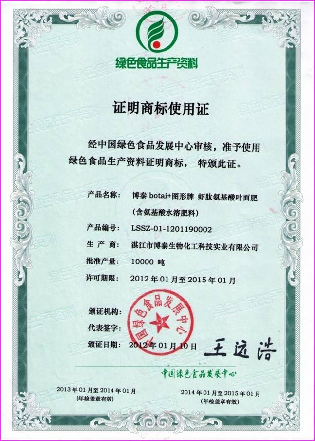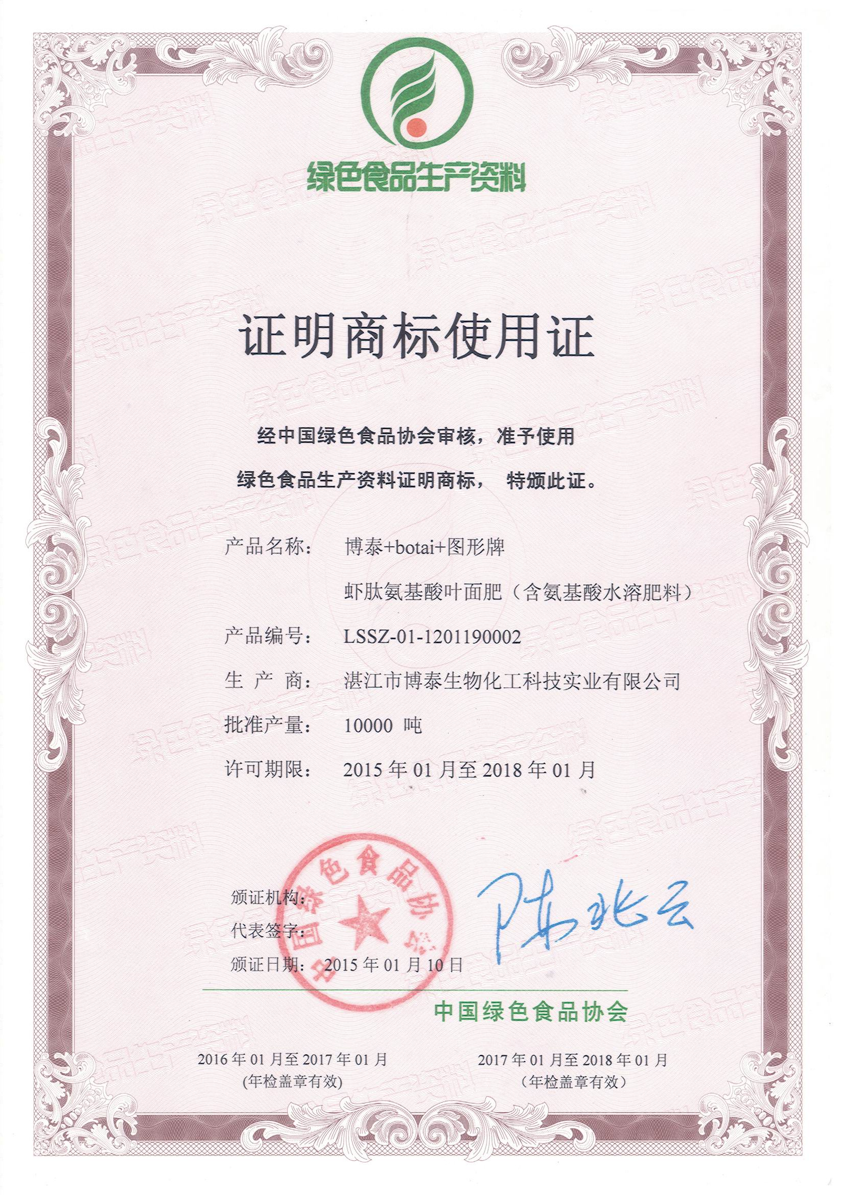 湛江博泰生物化工科技實(shí)業(yè)有限公司成功申報(bào)并在2012年1月10日和2015年1月10日分別獲得了由中國綠色食品發(fā)展中心和中國綠色協(xié)會頒發(fā)的“綠色食品生產(chǎn)資料證明商標(biāo)使用證”