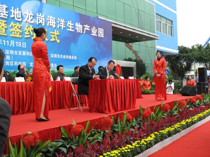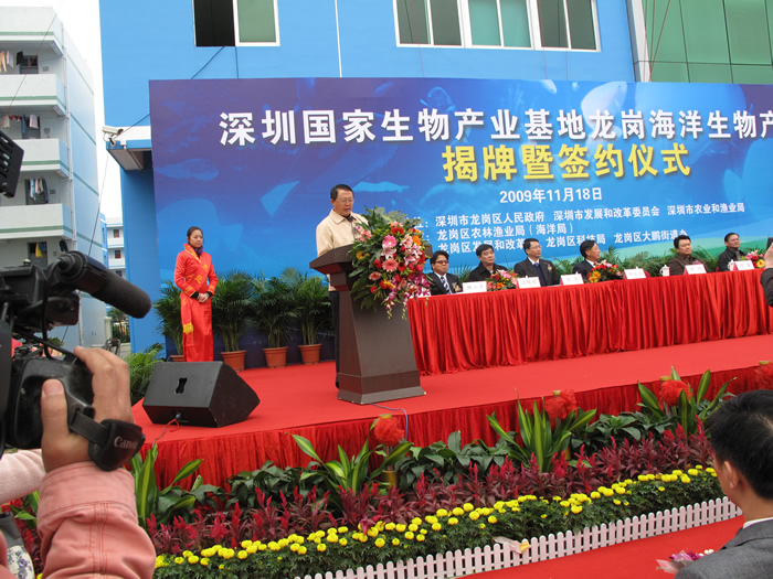 2009年11月18日,深圳國(guó)家生物產(chǎn)業(yè)基地龍崗海洋生物產(chǎn)業(yè)園揭牌暨項(xiàng)目簽約儀式在園內(nèi)隆重舉行,中科院院士倪嘉纘,美國(guó)工程院院士王兆凱,深圳市副市長(zhǎng)李銘,龍崗區(qū)區(qū)長(zhǎng)張備、副區(qū)長(zhǎng)熊小平等參加了揭牌和簽約儀式