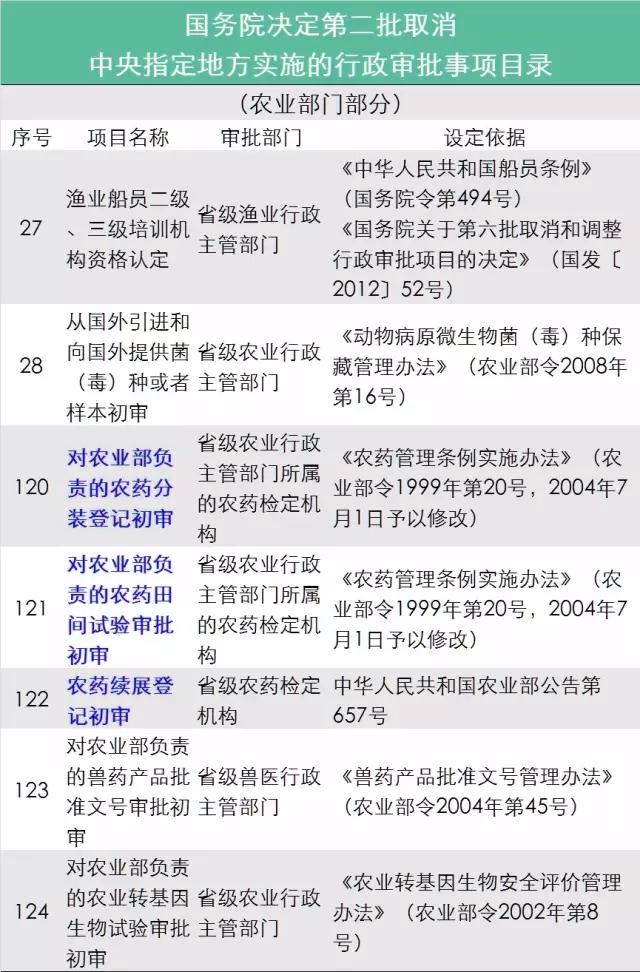 圖為 國務(wù)院決定第二批取消中央指定地方實(shí)施的行政審批事項(xiàng)目錄(農(nóng)業(yè)部門部分)