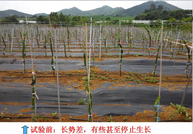 試用前期的火龍果的狀況:生產情況緩慢,甚至有些停止生長,總體生長差異較大。土壤酸性化(PH 3.89),根部有腐爛。